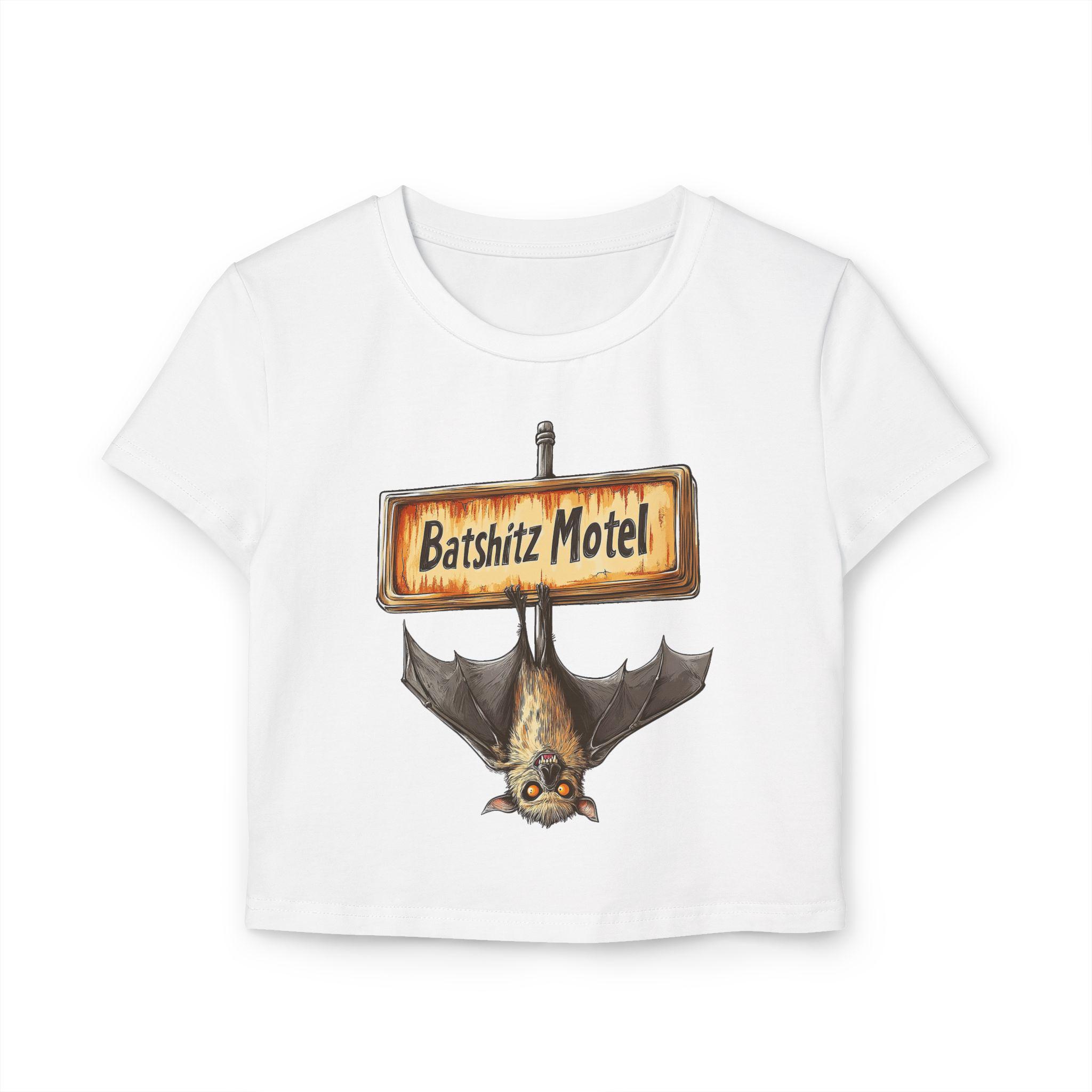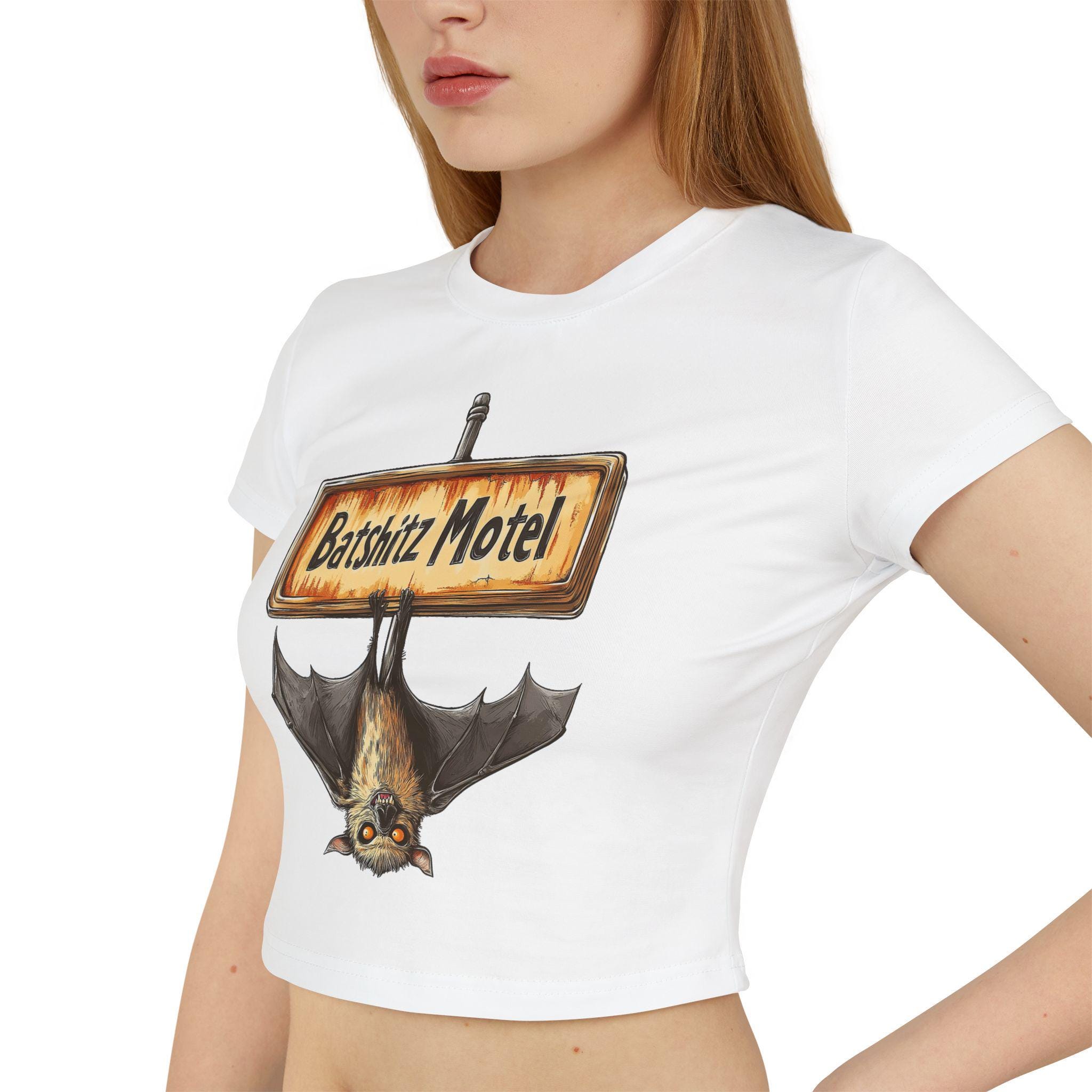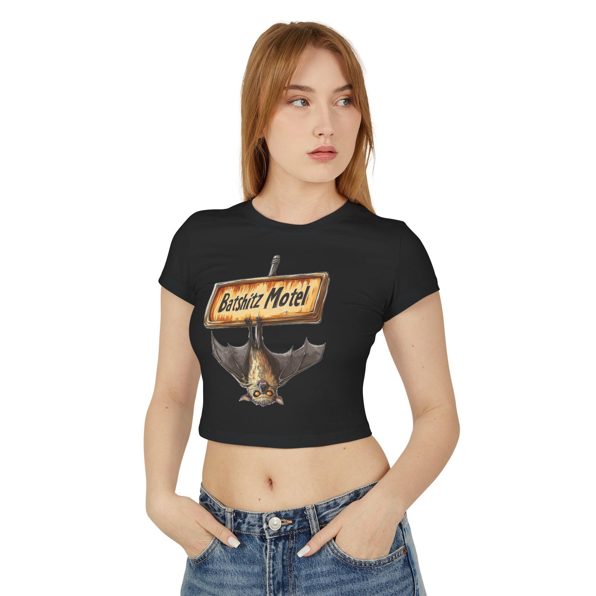 This Graphic Baby Tee is a sexy and cute addition to any woman's wardrobe. Perfect for those with a goth aesthetic, this tee features a bat illustration and can be styled as a crop top. The slim fit and organic cotton make it comfortable and flattering, suitable for everyday wear or a night out.